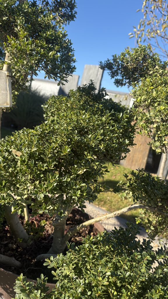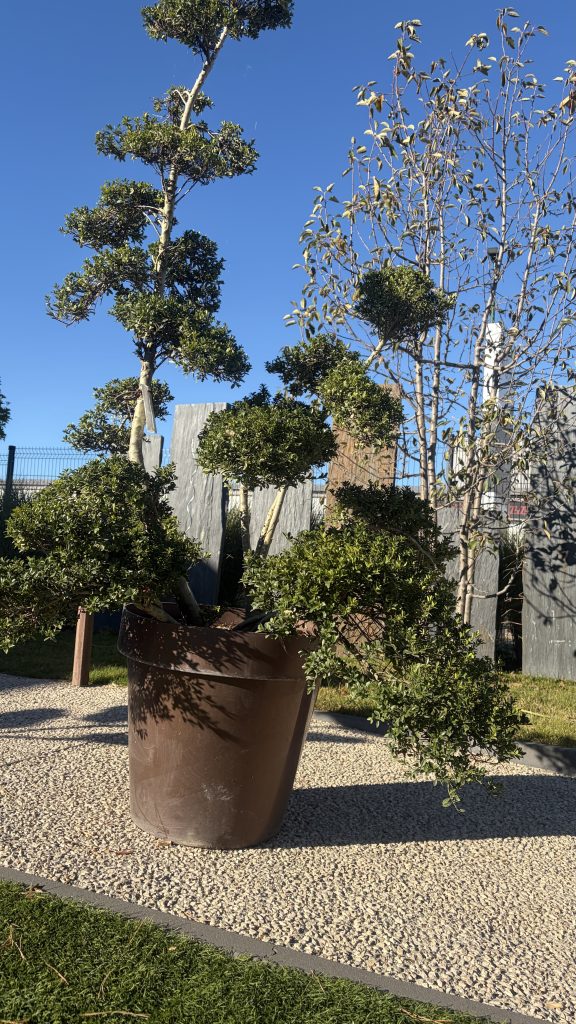 Le Houx crénelé, taillé en nuage est un arbuste persistant très prisé pour son port graphique et sa silhouette japonaise. Son feuillage dense et vert foncé, ainsi que sa forme sculptée, en font une pièce maîtresse dans un jardin contemporain, zen ou structuré.